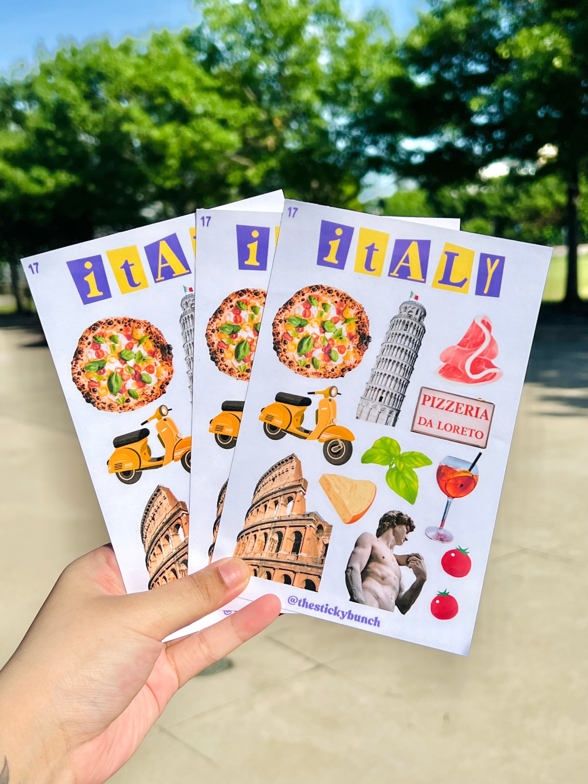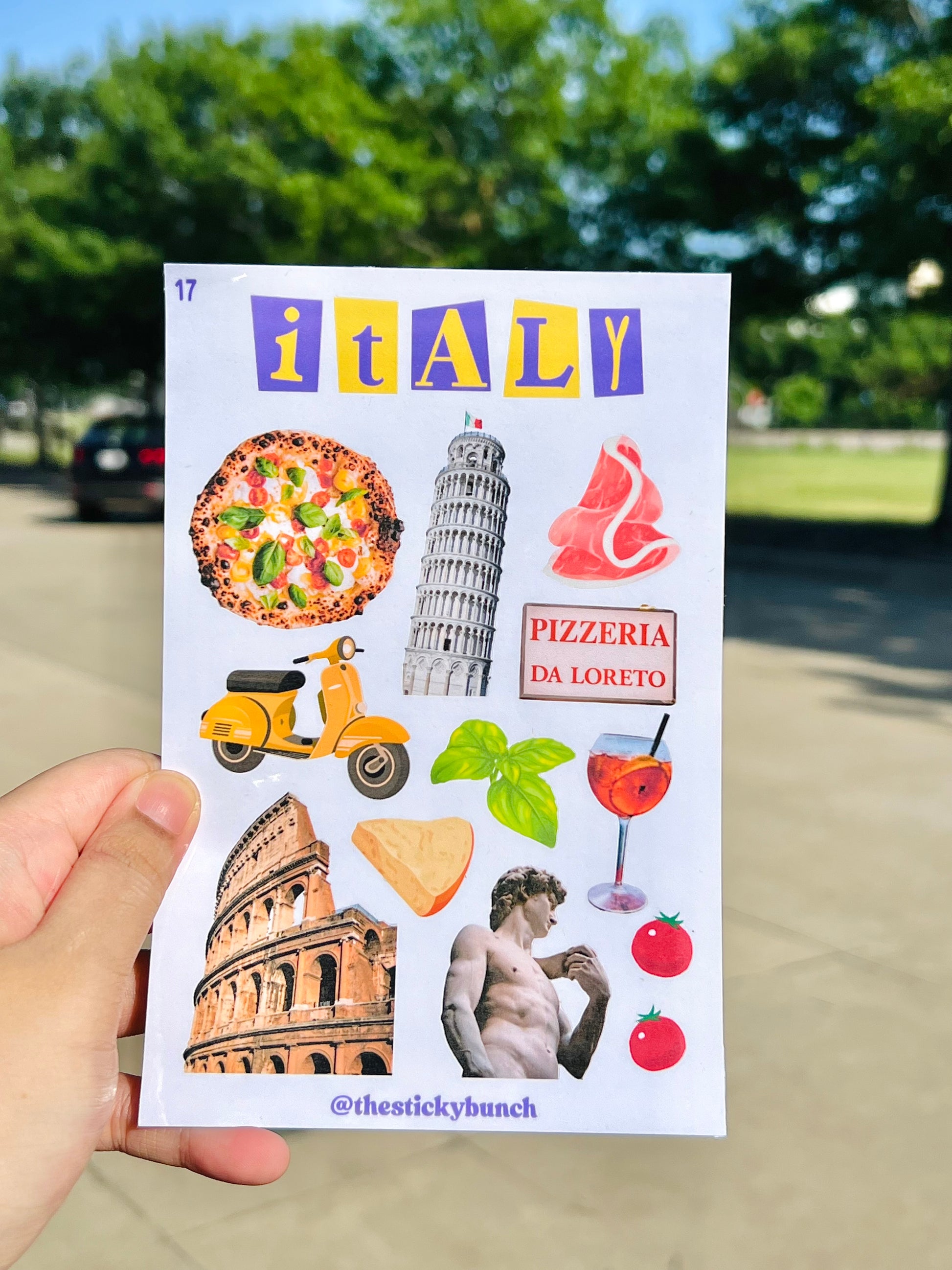 A tiny getaway to the land of amore and adventure! This sheet has 17 charming Italy-themed stickers (yep, including the title), featuring classic icons like Vespas, slices of pizza, and cheeky nods to Italian culture. Perfetto for giving your journal, planner, or laptop a little European flair.