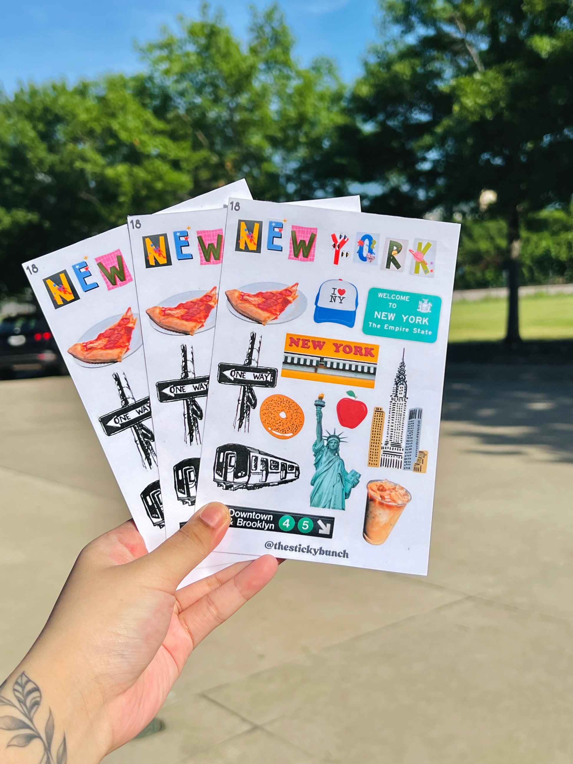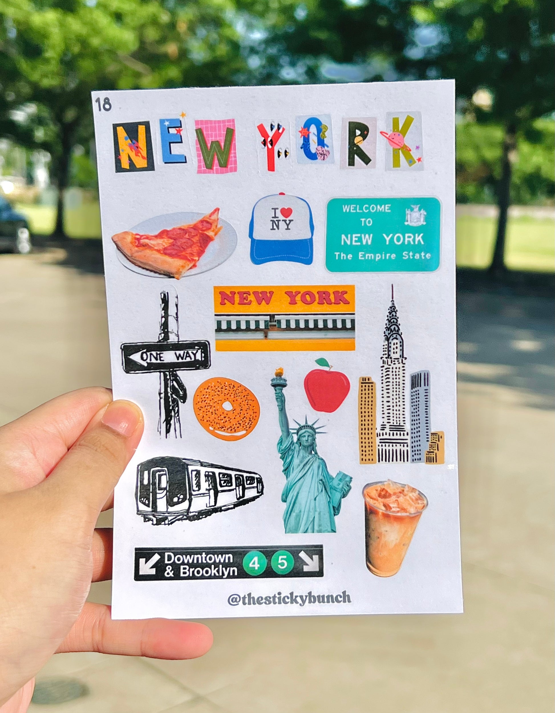 A little piece of the city that never sleeps! This sheet has 19 fun NYC-themed stickers (yep, including the title), featuring classic New York icons like yellow cabs, pizza slices, and more. Perfect for jazzing up your journal, laptop, or anything that could use a little city flair.