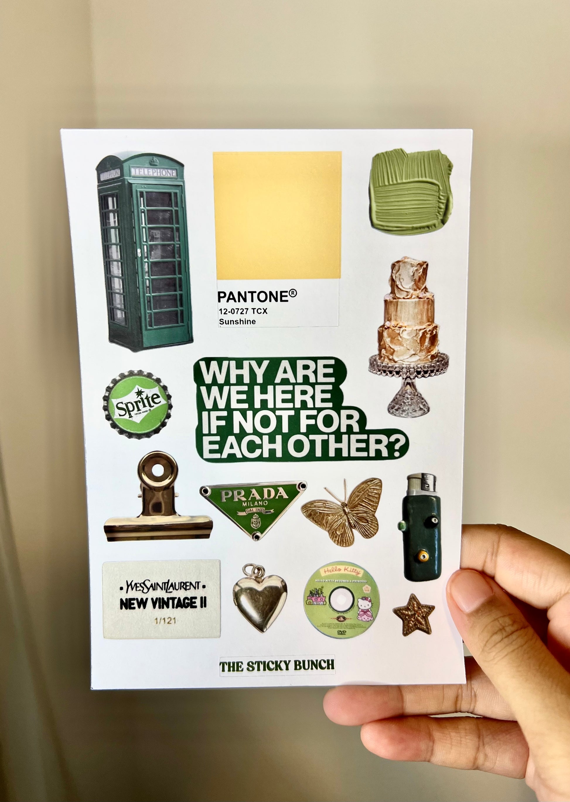 Make a statement with Why Are We Here If Not For Each Other?, a gold-and-green themed sticker sheet built around this heartfelt quote. With its rich tones and meaningful words, this sheet is perfect for adding depth to journal spreads, scrapbooks, or planners—reminding you that connection and community are what matter most.