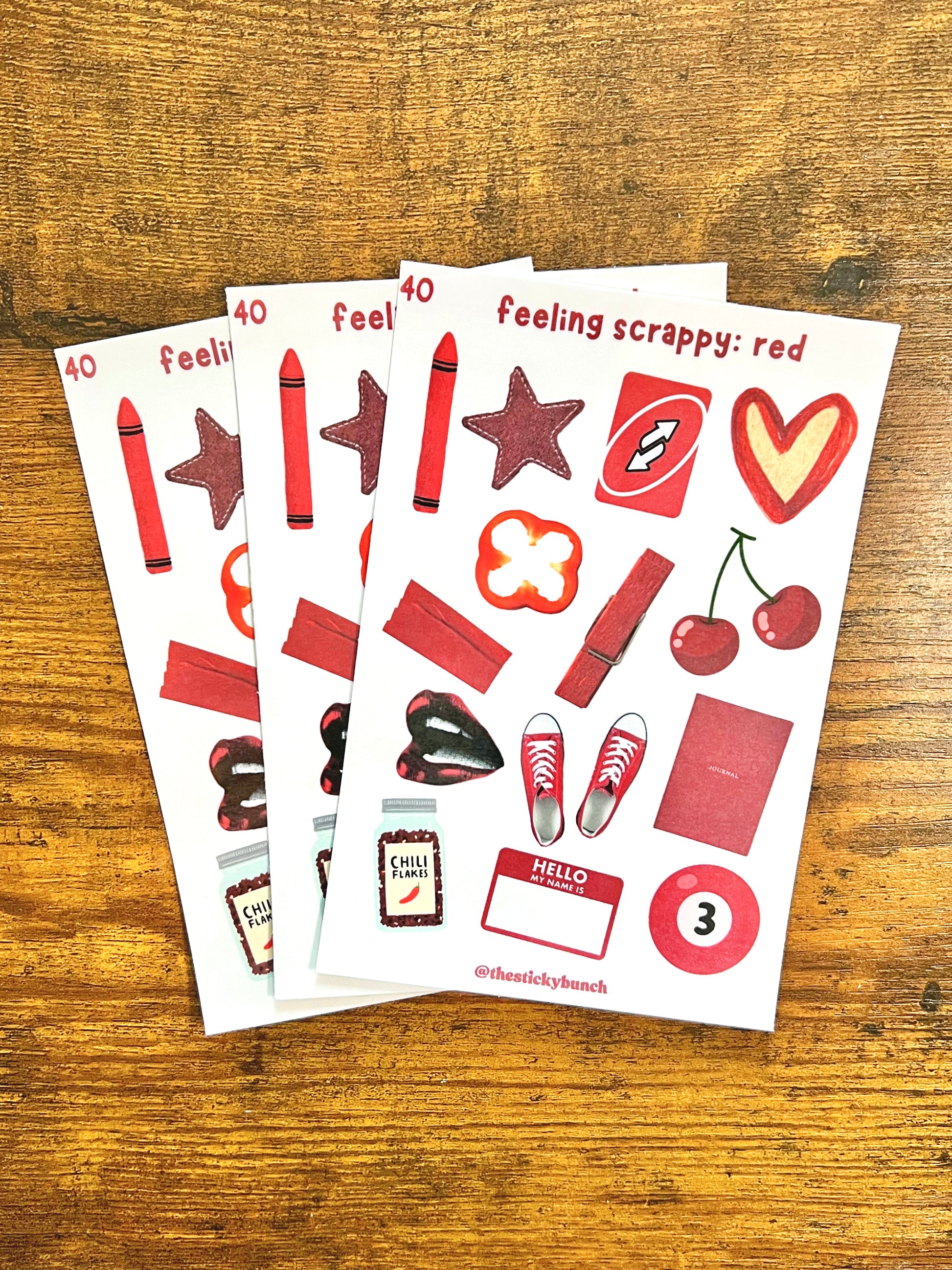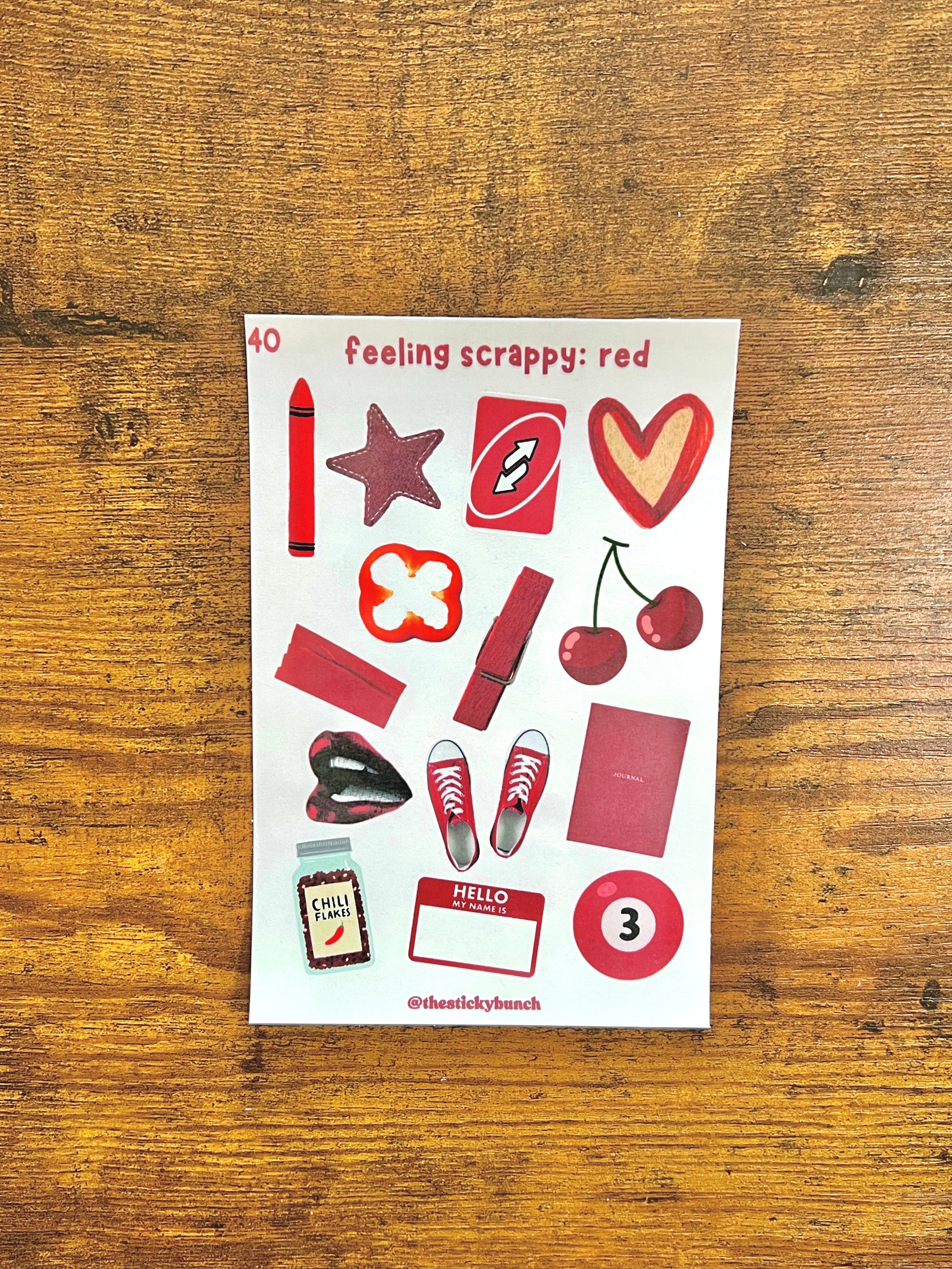 This Feeling Scrappy: Red sticker sheet is serving bold energy and a little bit of chaos—in the best way. Featuring a playful mix of random red-toned objects, from the iconic to the unexpected, this sheet is perfect for adding fiery flair to your journal, planner, or next collage spread.