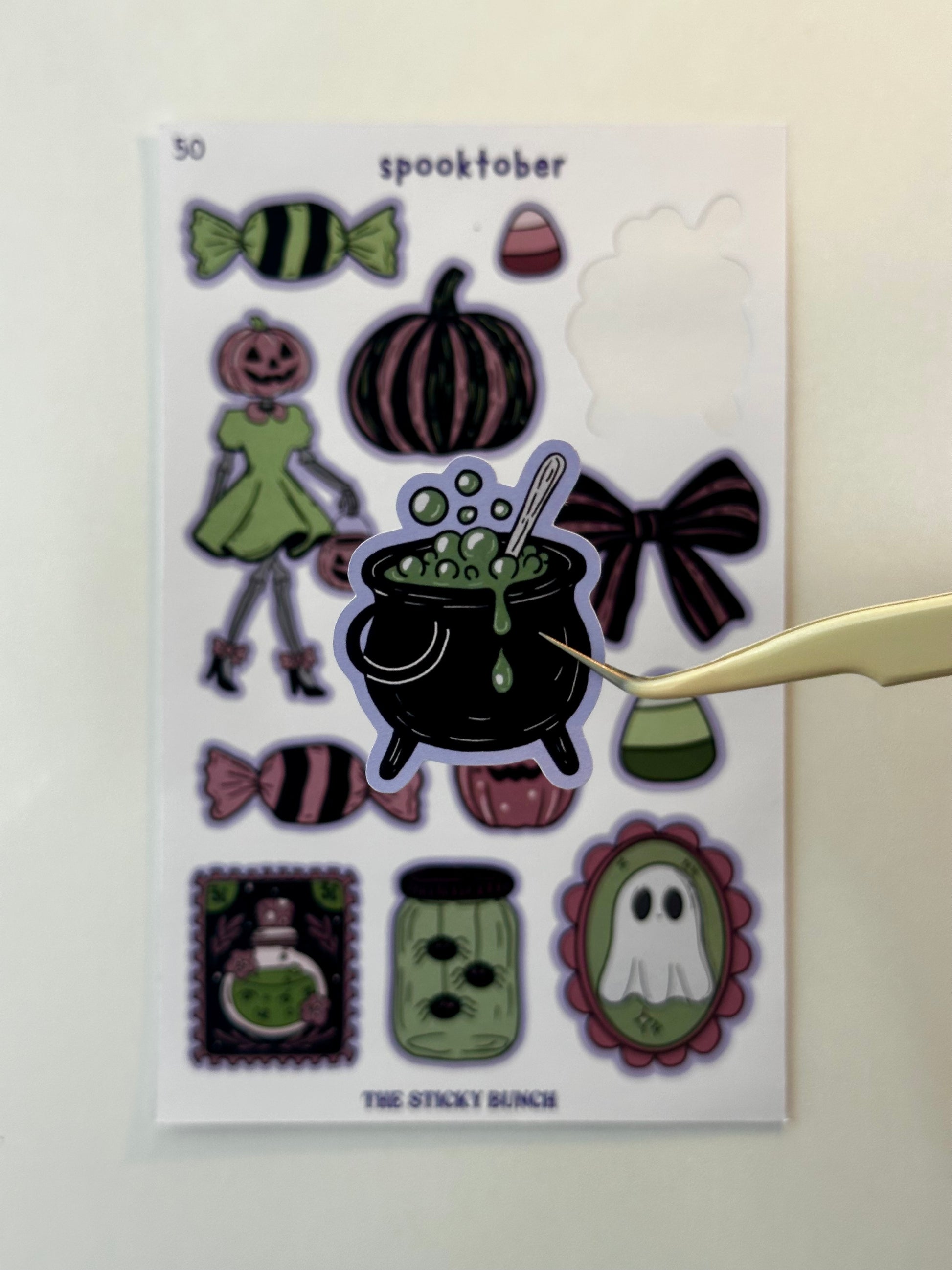 Get in the spirit of the season with 50 – Spooktober, a pink, green, and black sticker sheet made for all things witchy and fun. From skeletons and Halloween candy to magical details that bring spooky charm to your pages, this sheet strikes the perfect balance between cute and creepy.