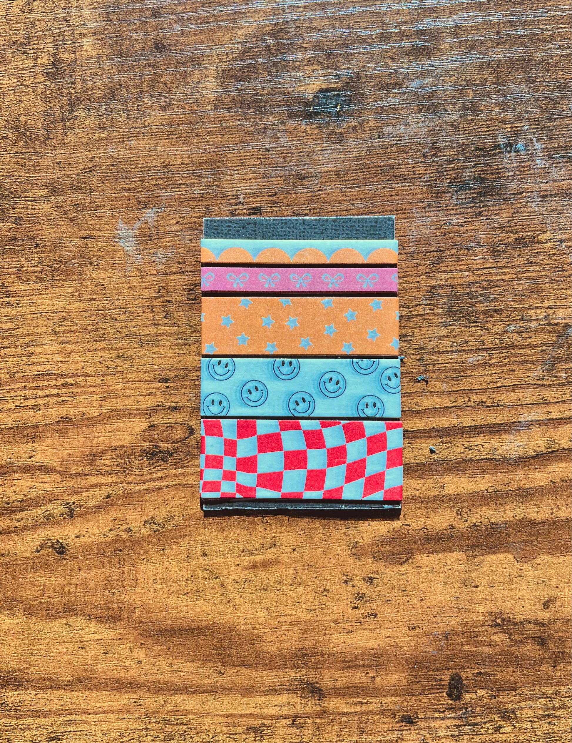 Bring on the nostalgia with this Retro Vibes Washi Tape Pack! Featuring 5 groovy designs in bold colors and funky patterns, each tape is 1 meter long—perfect for adding a splash of vintage flair to your journal, scrapbook, or snail mail.