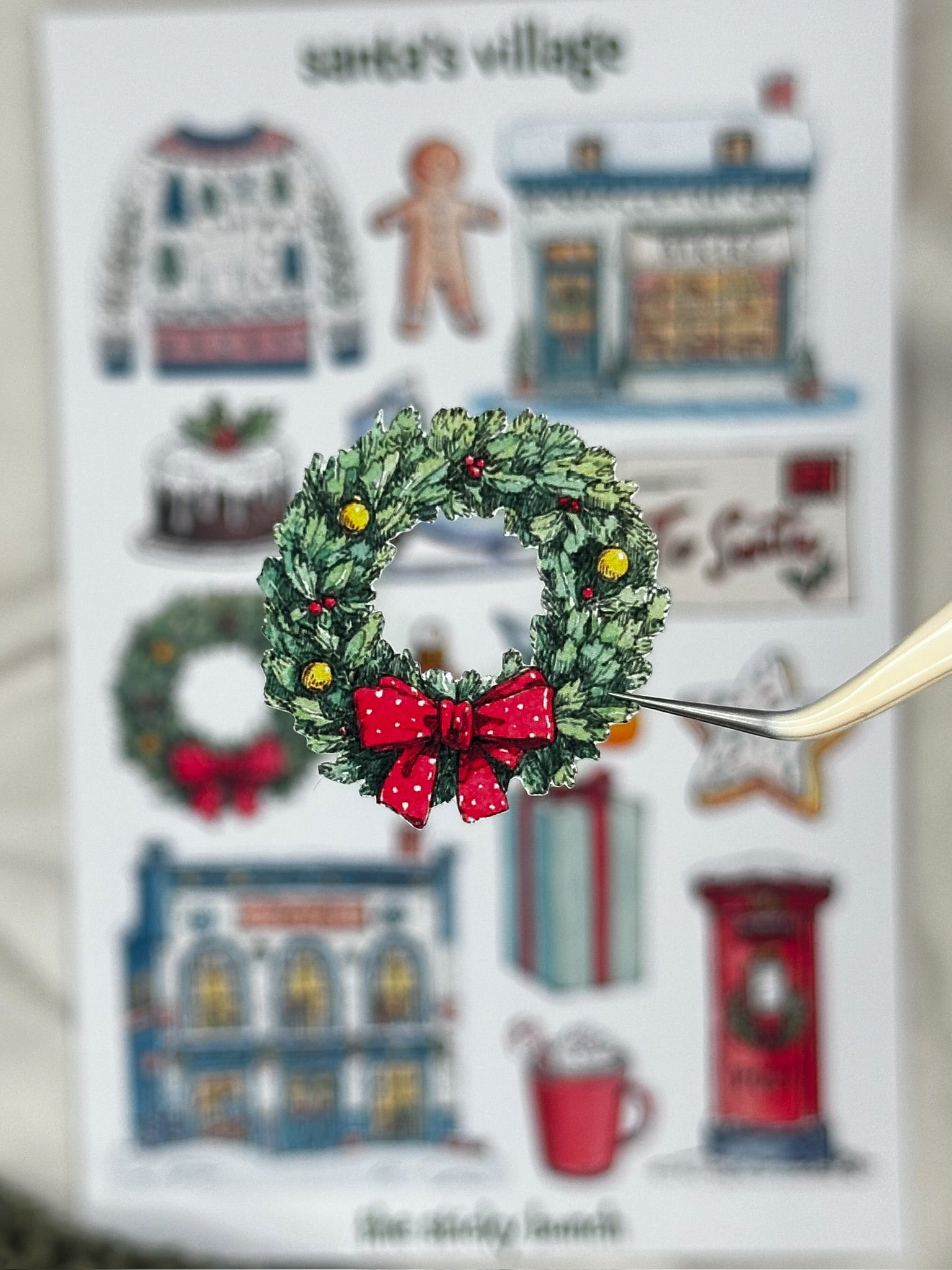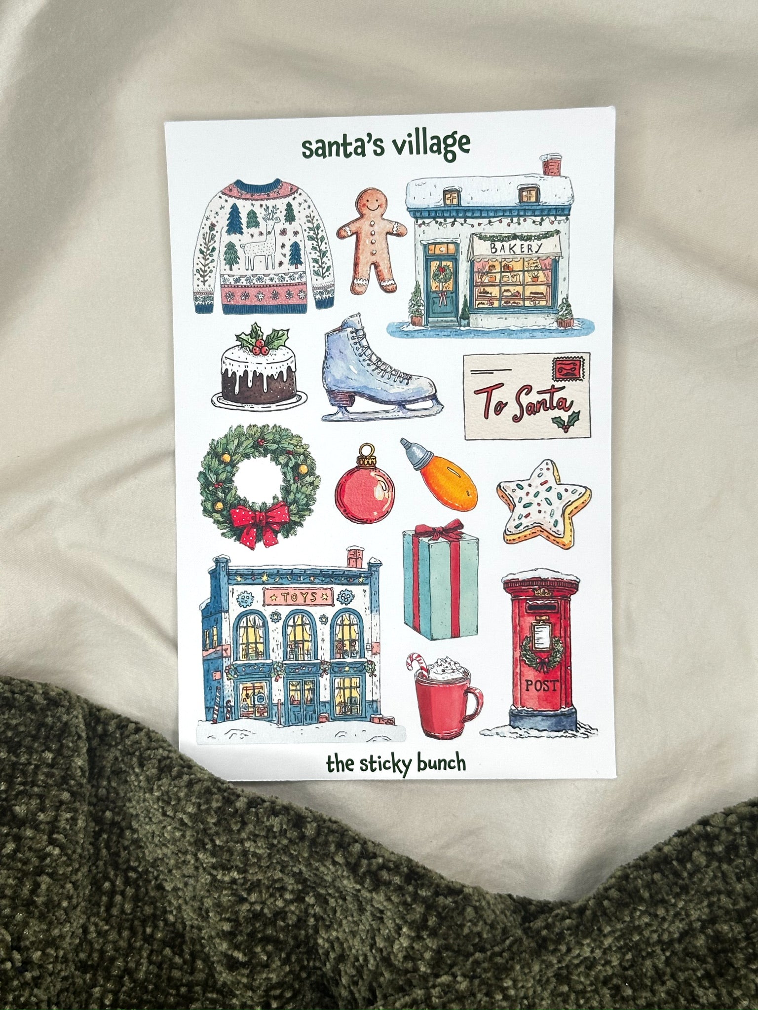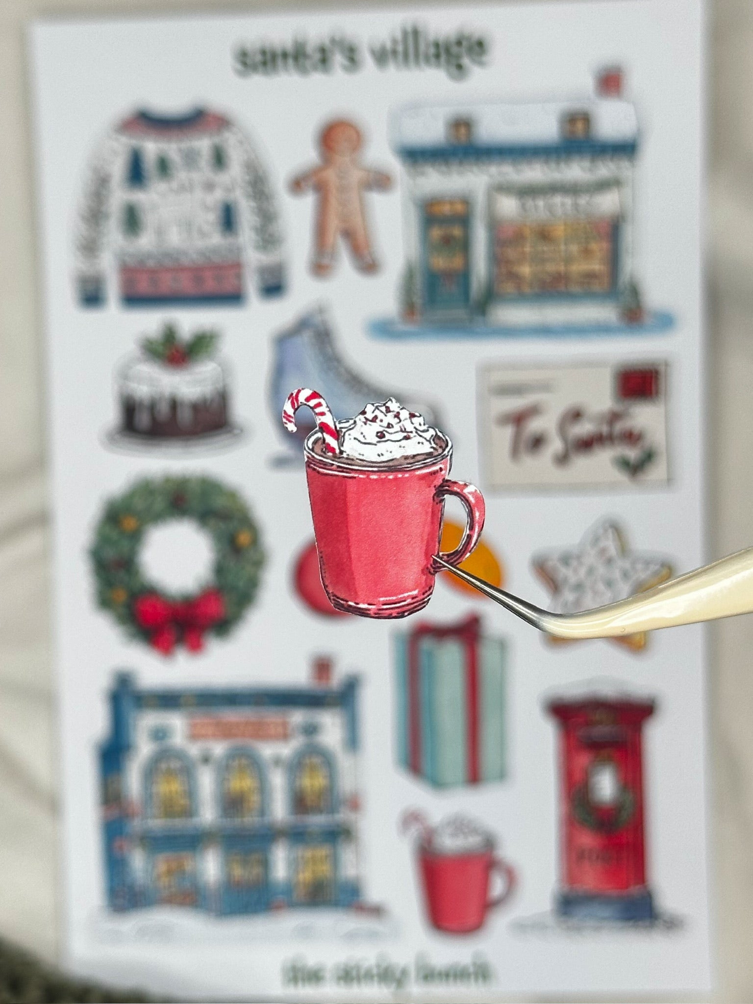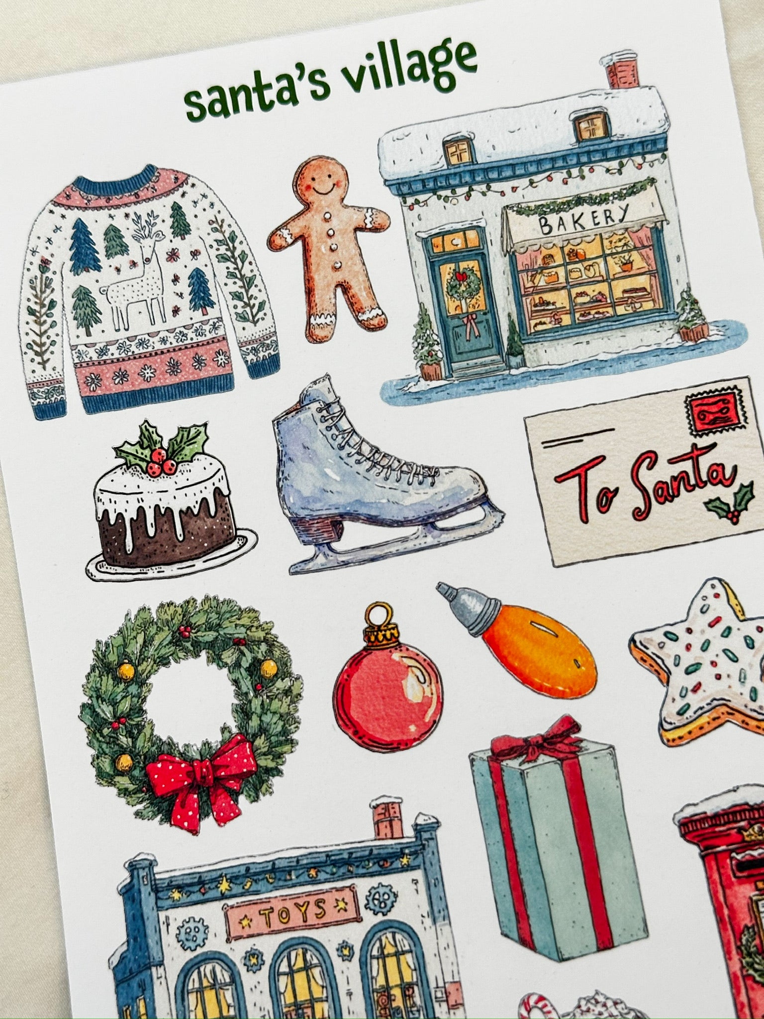 Welcome to Santa’s Village, a cozy watercolor collection inspired by the charm of the North Pole. This sheet features festive scenes like toy shops, bakeries, and sweet holiday treats, capturing the warmth and wonder of Christmastime in every detail.